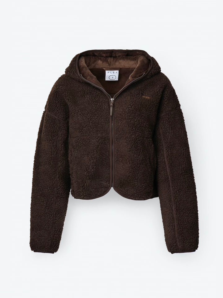 Pile hood jacket. Myk pile på utsiden, og fleece på innsiden. Hetter for kalde høst dager og lommer med glidelås. Snøring på siden for fasong. Normal. størrelsen. Modellene bruker S. Cropped design.
