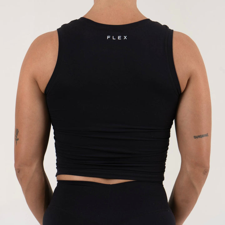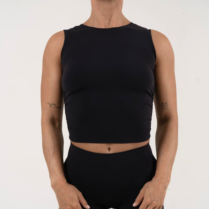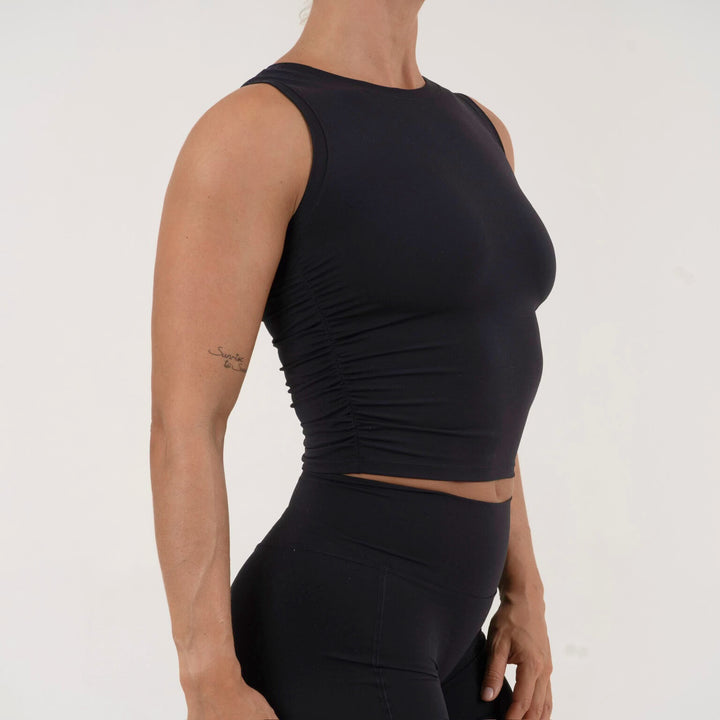 Super allsidig tank top med scrunch detalje på siden for silhuett. Har ikke bh under. Kun selve toppen. Passer over sportsbh eller alene.