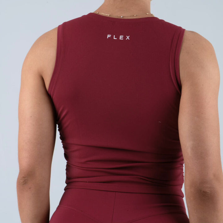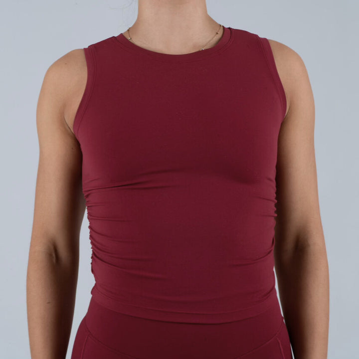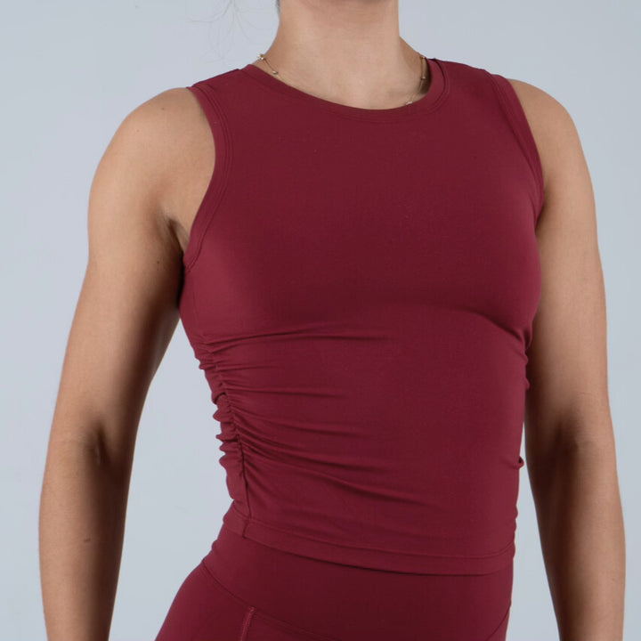 Super allsidig tank top med scrunch detalje på siden for silhuett. Har ikke bh under. Kun selve toppen. Passer over sportsbh eller alene.
