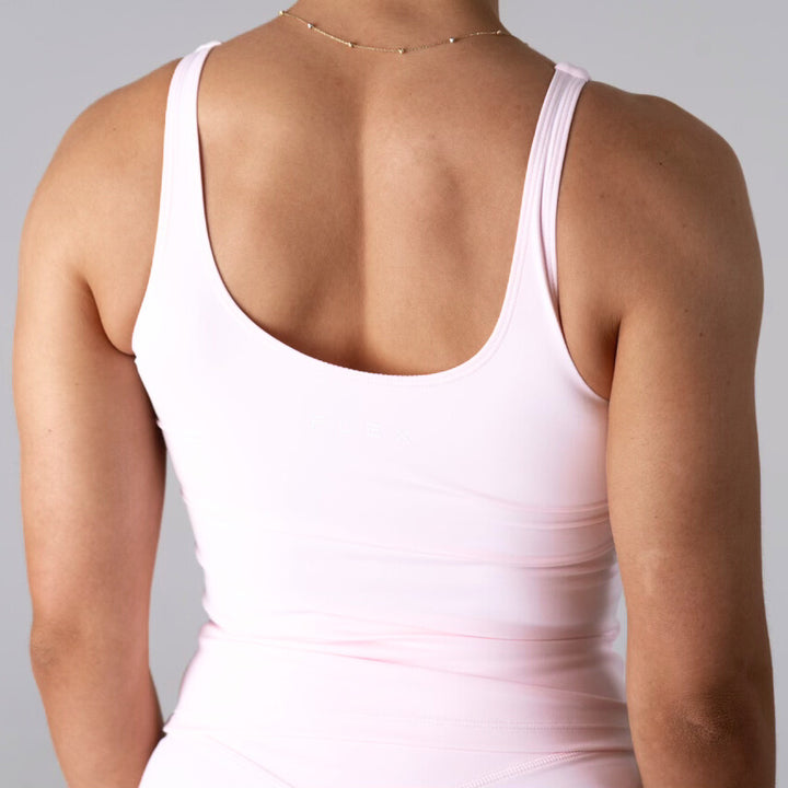 Stoffet er super mykt, stretch, tynt og matt. Delikat ton-i-ton silikon logo som tåler alt av vask og bruk. Innebygd sportsbh fremme men ikke bak. Da unngår man for stram fit på toppen. Innlegg kan tas ut. V fasong i front for god støtte og dekke.