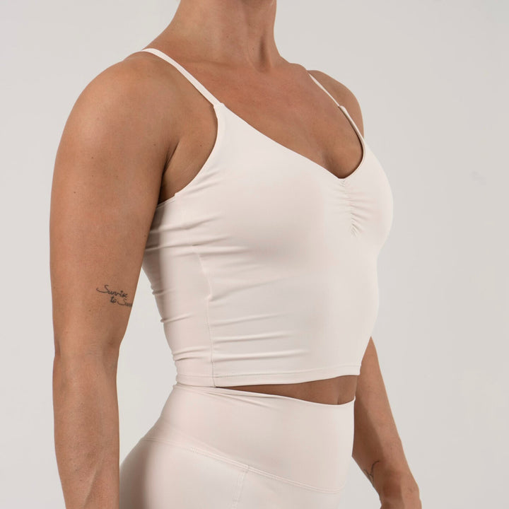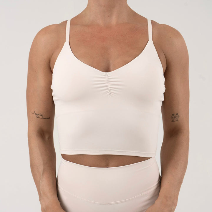 Stoffet er super mykt, stretch, tynt og matt. Innebygd sportsbh fremme men ikke bak. Da unngår man for stram fit på toppen. Innlegg kan tas ut. V fasong i front for god støtte. Stroppene kan løsnes bak og festes på 3 måter, rett ned, i kryss eller som halterneck rundt nakken. 3in1 design.