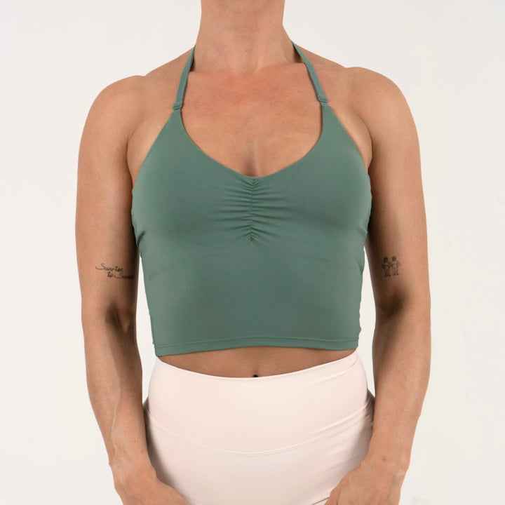 Stoffet er super mykt, stretch, tynt og matt. Innebygd sportsbh fremme men ikke bak. Da unngår man for stram fit på toppen. Innlegg kan tas ut. V fasong i front for god støtte. Stroppene kan løsnes bak og festes på 3 måter, rett ned, i kryss eller som halterneck rundt nakken. 3in1 design.