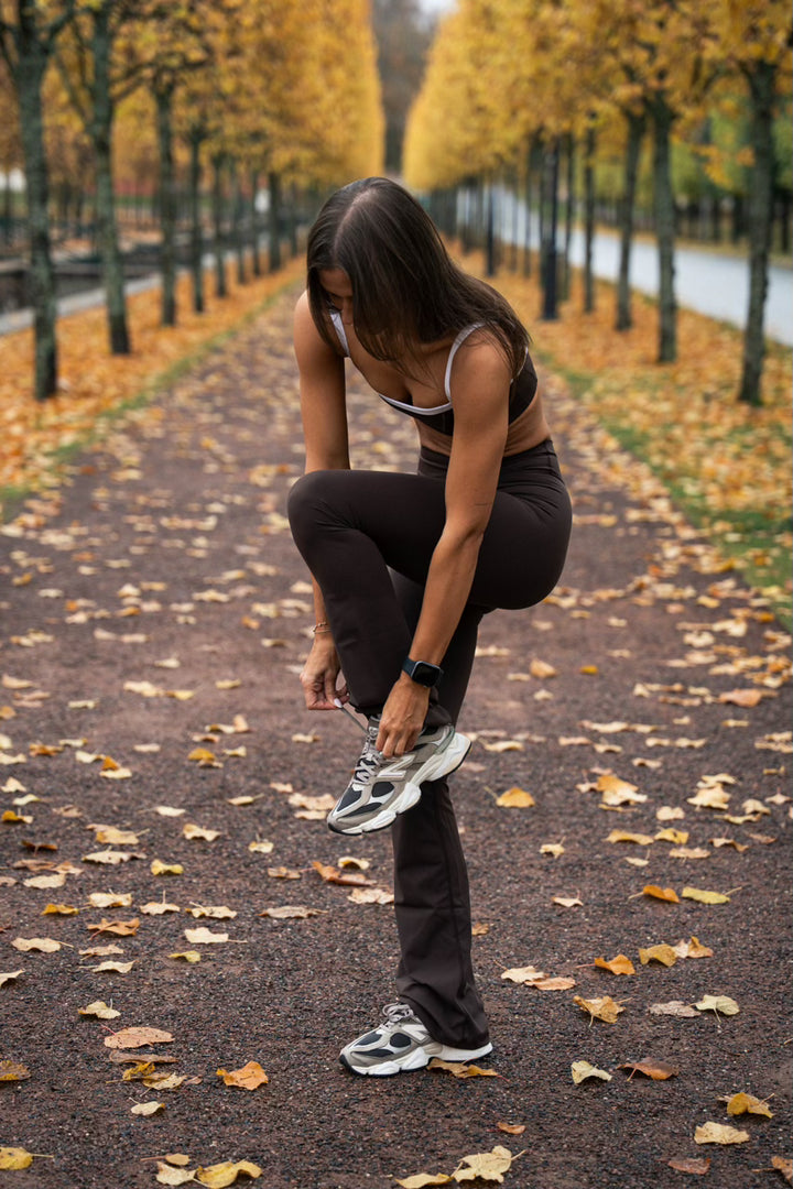 Alt du trenger i en flare yoga pant. Ingen søm foran. Wrap yoga er med scrunch, men det en elastisk strikk derfor synes ikke scrunchen når plagget er på, den strekker seg ut og former fint uten at det er synlig at den har scrunch. I den grad strikken strekkes avhenger av hvor mye man trekker bak og vil være individuelt.