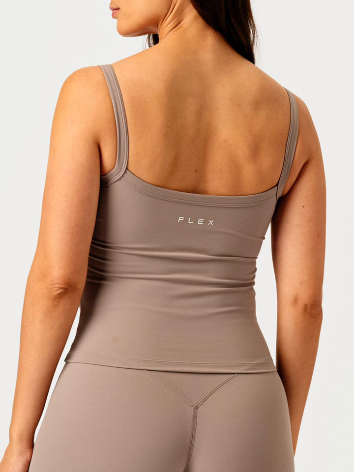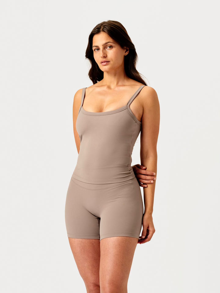 Stoffet er super mykt, stretch, tynt og matt. Innebygd sportsbh fremme men ikke bak. Da unngår man for stram fit på toppen. Innlegg kan tas ut. V fasong i front for god støtte.