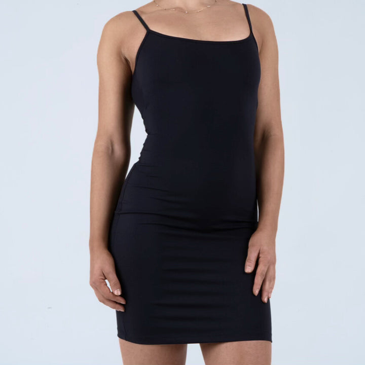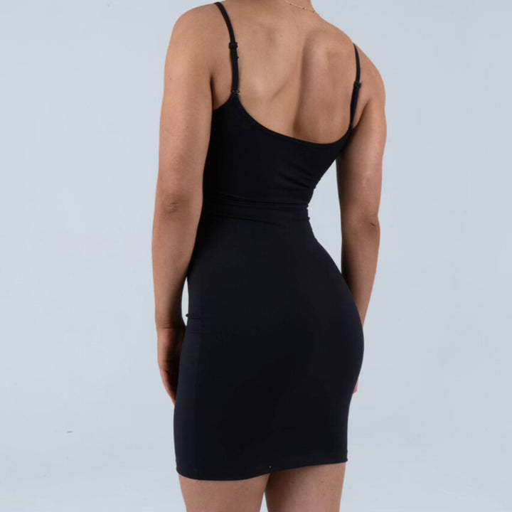 Shaping, sculpting for figurnær kjole. Laget i samme stoff som bestselgende Opule fabric. Super mykt, cellulitt fritt og stretch. Innebygd bh fremme med innlegg som kan tas ut, ingen bh bak for jevn fasong. Lår lengde eller lang lengde maxi. Kommer i 3 farger, sort, brun og rød. Normal i størrelsen. Modellen har på S. Justerbare stropper med hempe, velg kryss eller rett ned. Ingen logo eller annet.