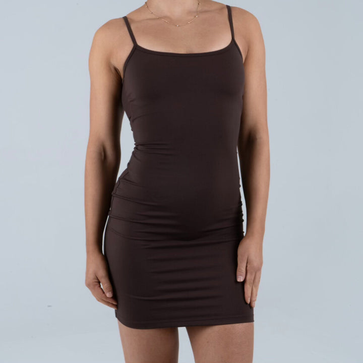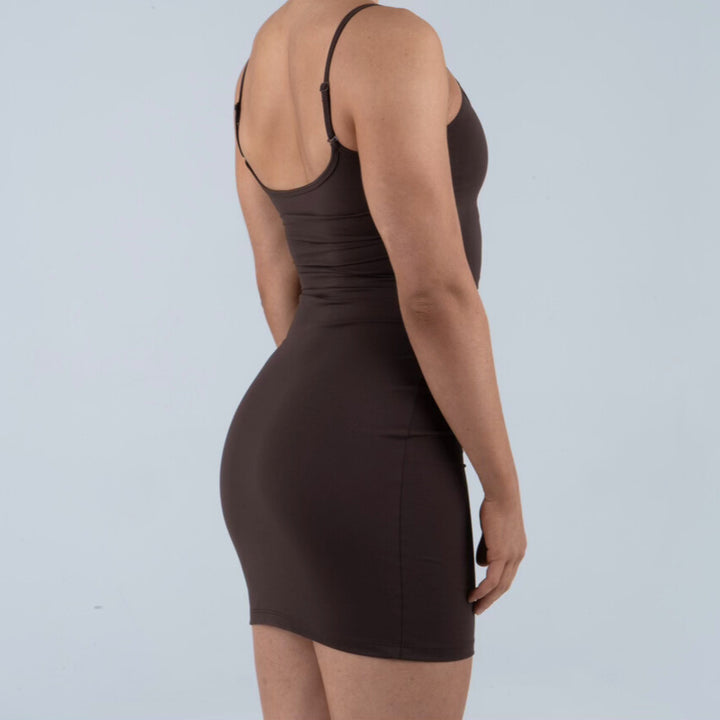 Shaping, sculpting for figurnær kjole. Laget i samme stoff som bestselgende Opule fabric. Super mykt, cellulitt fritt og stretch. Innebygd bh fremme med innlegg som kan tas ut, ingen bh bak for jevn fasong. Lår lengde eller lang lengde maxi. Kommer i 3 farger, sort, brun og rød. Normal i størrelsen. Modellen har på S. Justerbare stropper med hempe, velg kryss eller rett ned. Ingen logo eller annet.